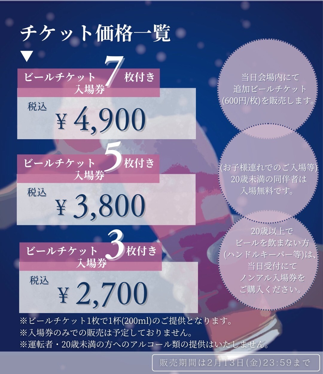 ※ビールを飲まない方(ハンドルキーパーやお酒が飲めない方など)は当日受付にてノンアル入場券(500円)をご購入下さい。ネックストラップをお渡しします。